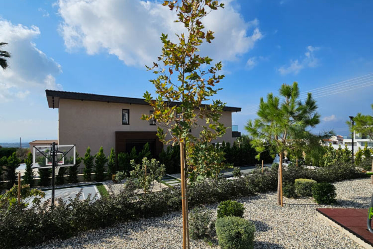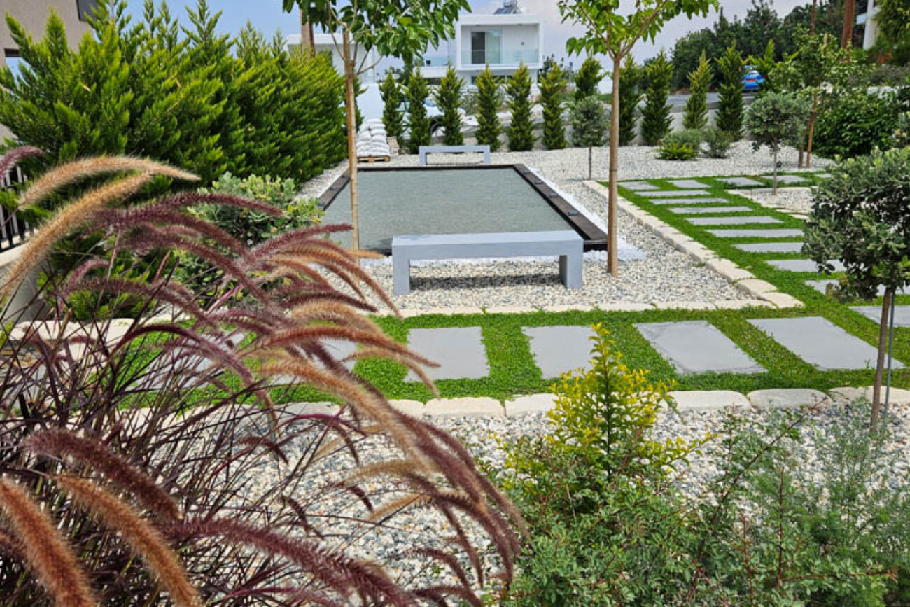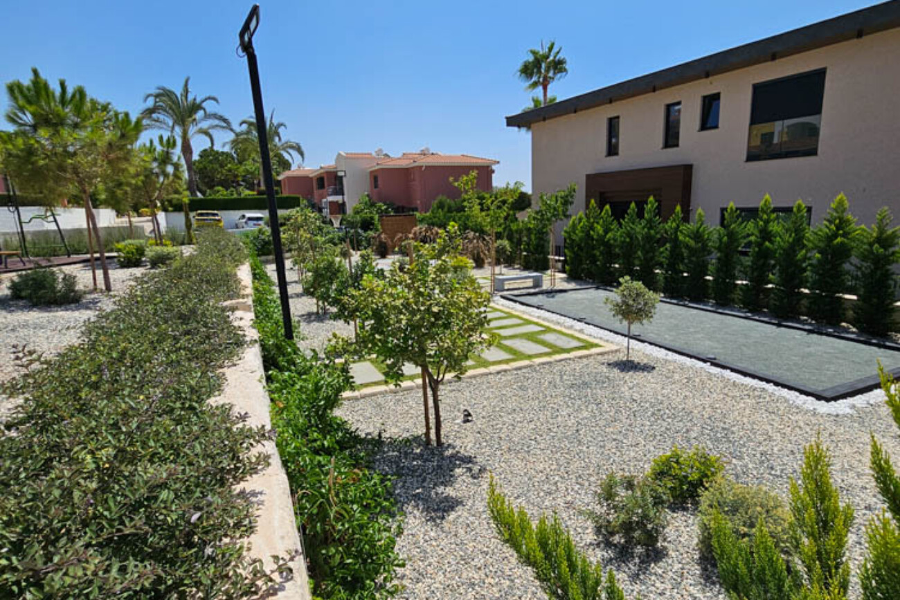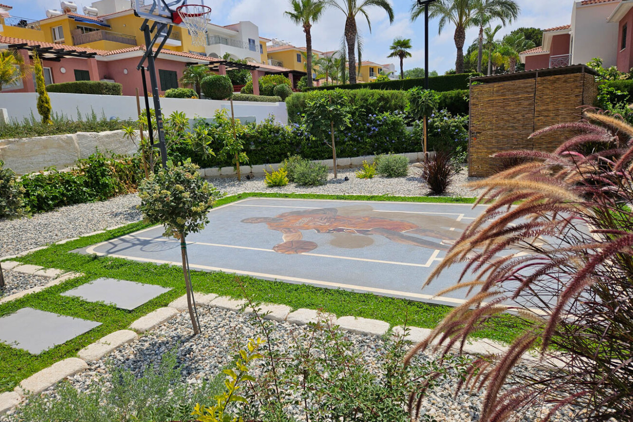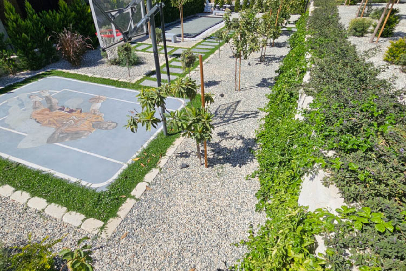 A distinctive garden was designed to enhance the property’s unique style and atmosphere. The layout combines a variety of plant species to create depth and visual interest, while carefully planned pathways and focal points ensure a seamless flow throughout the space. Emphasis was placed on blending natural beauty with functionality, resulting in an outdoor environment that is both inviting and enduring. The design also includes a petanque pitch and a basketball court, thoughtfully integrated to provide recreational opportunities without compromising the garden’s aesthetic appeal.